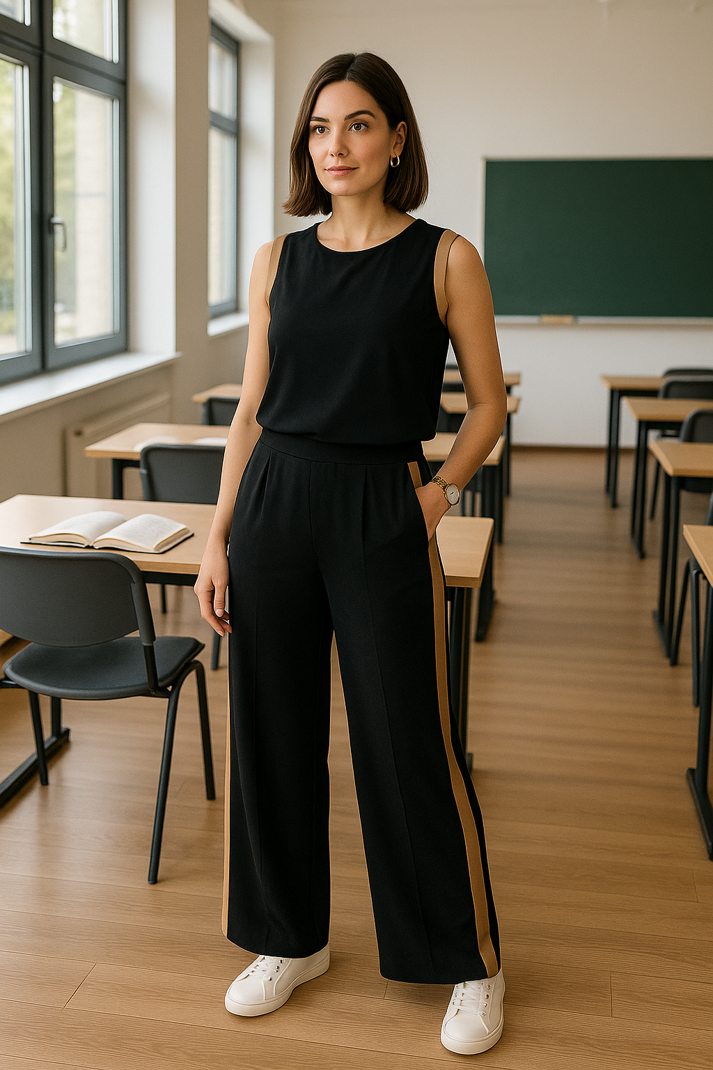Conjunto de calça e blusa sem manga. Calça com elastico na cintura. Calça com detalhe em bege.